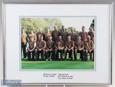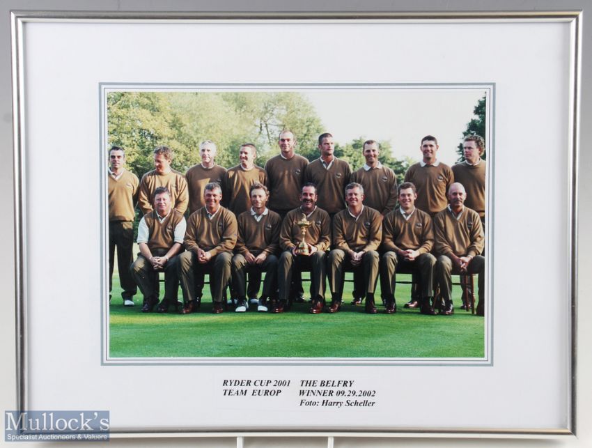 2001/02 Victorious European Ryder Cup Team Official Photograph - played in 2002 after the 9/11 attack on New York in 2001- played at the Belfry with Europe coming out winners 15.5-12.5 with both teams going into the final round level on points - mf&g overall 12.25" x 16"