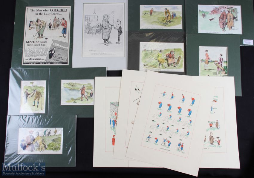 Hand Coloured Golf Prints, Adverts Cartoon, a mixed collection of various artists, 9 are mounted ready to frame 5 are loose (14)