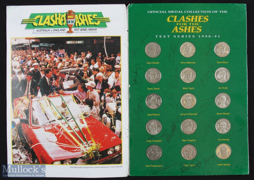 Multi-Signed Official Medal Collection of the Clashes for the Ashes Test Series 1990-91 - featuring 15 medallions within folder, each accompanied with a signature includes Allan Border, Ian Healy, Geoff Marsh, Dean Jones, Mark Taylor - appears A/G overall