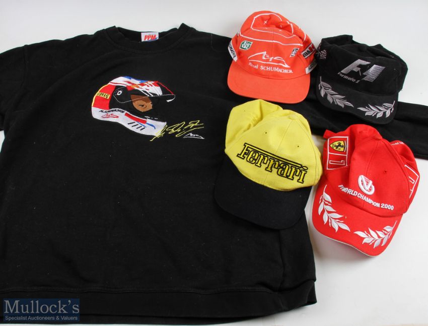 Formula 1 Michael Schumacher Ferrari Sweatshirt, caps, to include a Michael Schumacher collection black embroidered sweatshirt size L, 4 Ferrari + F1 caps