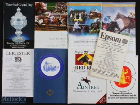 1969-2007 Signed Horse Racing Score cards and others, to include Epson 24th April 1969 at Eddy first winning ride in UK, Haydock Park 4th March 1978 - Red Rum's last race, Aintree 3rd May 1995 signed Don McCain, Royal Winsor 3rd Dec 1998 its last national hunt meet, Leicester 9th Jan 1990 signed ?, Cheltenham 13th March 1990 signed Bobby Ruben, Cheltenham 24th Jan 2004 signed by all jockeys, Cheltenham 15th 2005 signed by all jockeys and winner to cover, Cheltenham 13th March 2007 signed by all jockeys (9)