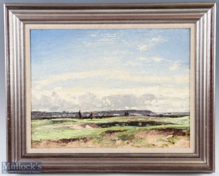 WILLIAM PAGE ATKINSON WELLS, RBA (1872-1923) The 9th Green Westward Ho! - Royal North Devon Golf Course oil on board signed William Wells lower right - image 12" x 16" - c/w original label laid down on the verso. Note Born Glasgow in 1872 and studied at the Slade before moving to Sydney, Australia where he lived and worked for 5 years. Returned to Europe, working in Paris under Bouguereau and Ferrier in Paris. Lived in rural France for a time where he became an admirer of the Barbizon school. After a short stay in Glasgow he settled in Preston for 7 years as a scene painter before finally settling in Devon where he became well known for his rural and landscape scenes.