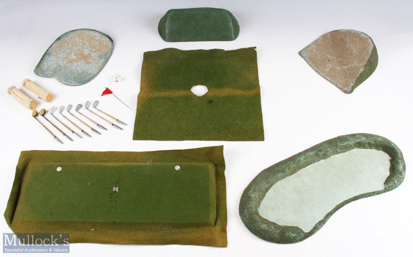 Scarce A Schoenhut Golfing Game circa 1920s - features 'Tommy Green' and 'Sissy Lofter'- the figures attached to the end of full-size club shafts with trigger mechanism attached enabling a swinging motion (in working order), also features Teeing area, green and flagstick, 4x hazards, course boundary rope, 2 miniature golf bags, golf clubs and miniature golf balls - appears in working order with as expected age related wear, maker's marks to shafts of both