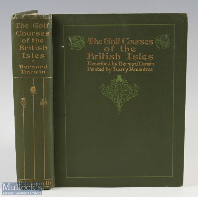 Darwin, Bernard - "The Golf Courses of the British Isles" 1st ed 1910 with 64 illustrations by Harry Rountree c/w tissue covers - in original green and gilt cloth decorative boards and spine, gilt lined top edge of pages, internally some speckle foxing, and some discolouration to the edges - owners name to the inside plus address card laid down otherwise clean and tight - good boards and spine G