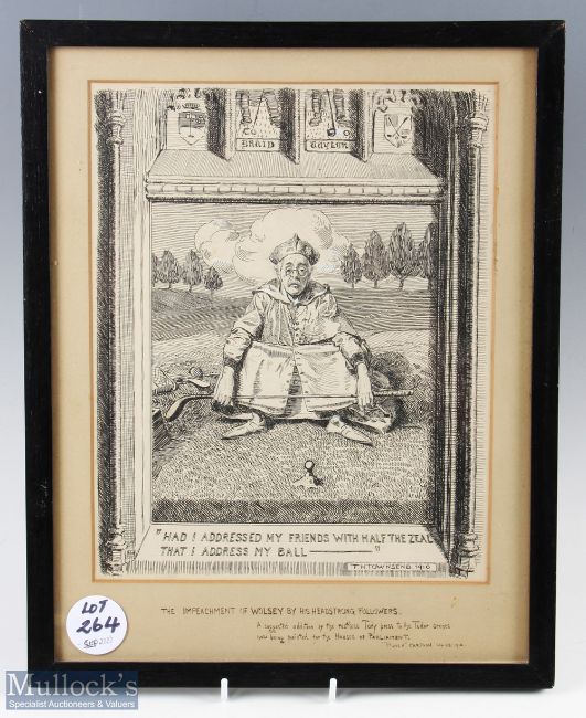 F H Townsend (artist and famous editor of "Punch") titled "The Impeachment of Wolsey" original hand drawn pen and ink golfing scene with reference to Braid and Taylor above, signed and dated 1910 with further annotation "Had I Addressed My Friends with Half the Zeal That I Addressed My Ball" and to the mount 'The Impeachment of Wolsey by His Headstrong Followers. A suggested addition by the restless Tory press to the Tudor scenes now being painted by the Houses of Parliament "Punch" cartoon September 28, 1910 - image 12" x 9.5" - mf&g overall 16" x 12.75"
