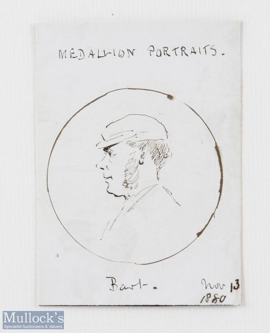 THOMAS HODGE (b.1827-d.1907) - Royal and Ancient Golf Club St Andrews Personality- head and shoulder portrait sketch titled "Medallion Portraits - Bart. Nov 13 1880" c/w typed details below - image 4.25 x 3" - mf&g 15.25 x 11". Note: Part Four - Golf Collection from "David Easby Estate"