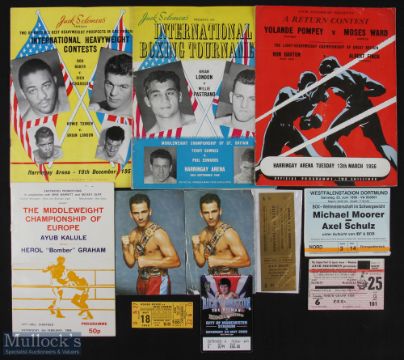 1956-2008 Boxing programmes and Tickets, to include programmes of Yolande Pompey v Moses Ward 13th March 1956, Brian London v Willie Pastrano 30th Sept 1958-has damage to cover, Bob Baker v Dick Richardson 10th Dec 1957, Ayub Kalule v Herol Bomber Graham Sheffield 5th Feb 1986, tickets of Alan Rudkin v Walter McGowan Nino Benvenuti v Doyle Baird, Roger Rouse v Jose Torres 1968, Michael Moorer v Axel Schulz 1996, and a Ricky Hatton home coming ticket 2008, 2 signed Carl Crook photo cards (11)