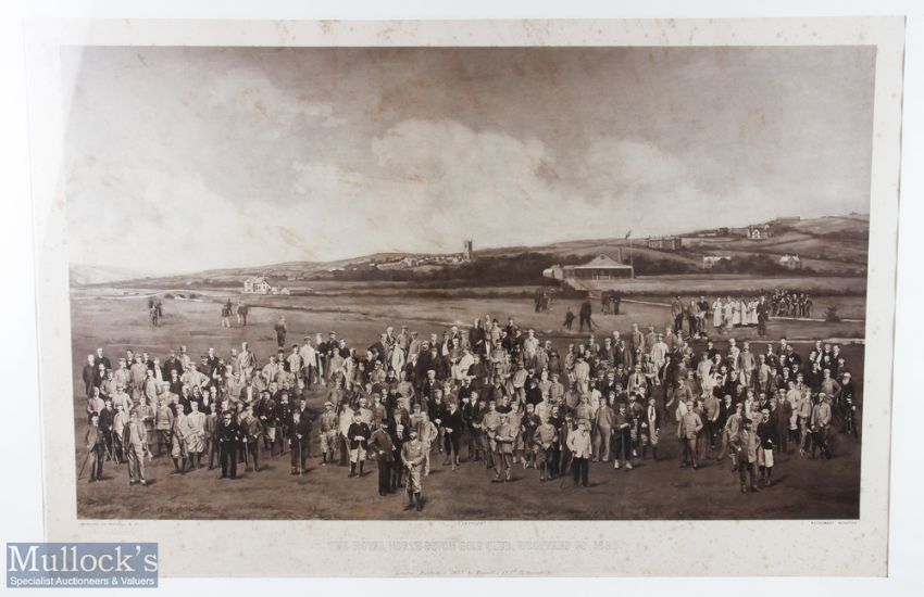 1893 Royal North Devon Golf Club "Members" Photogravure style original print by Mayall & Co Ltd - an impressive image of the members of the 'Royal North Devon Golf Club, Westward Ho!' from 1893. The figures are all photographs superimposed onto a background of the course. In the margin is printed 'Permanent Autotype" and produced by Mayall & Co. Ltd. 73 Piccadilly'. Some foxing and age stains - image 23.5" x 36" mf&g c/w gilt slips 34.5 x 48". The image appears very much photographic but is more of a photomechanical print rather than a photograph. John Jabez Edwin Paisley Mayall (1813-1901) was an English photographer who in 1860 took the first carte-de-visite photographs of Queen Victoria. Note The picture was given to David Stirk in 1976 by Jack Gibson, son of Charles Gibson who was golf professional at RNDGC from 1888-1915 and then passed onto fellow member David Easby - c/w typed details laid down on the reverse.