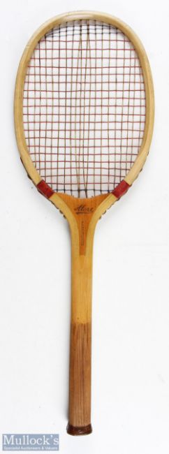 c1920 G G Bussey & Co Alert Tennis Racket, with wavy wedge, shoulder strapping and leather butt cover, string are complete good clean condition