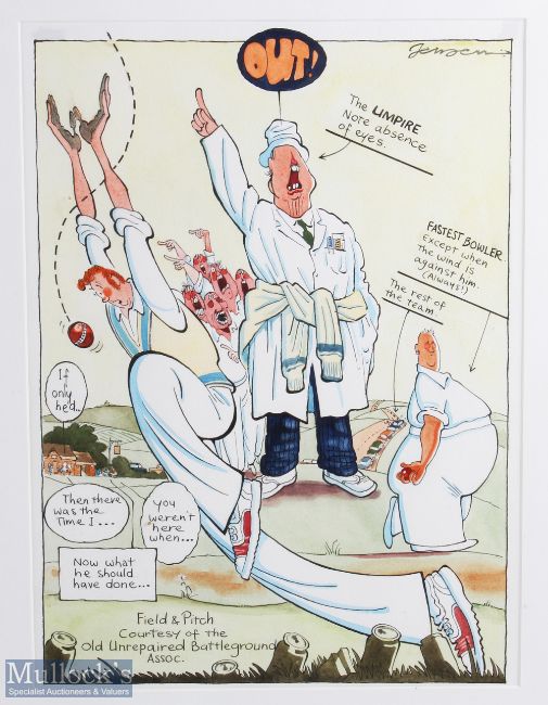 John Jensen Framed Cricket Cartoon Caricature, 2 x original pictures of a cricket family album, and a cricket seen titles field & pitch, both framed & mounted under glass