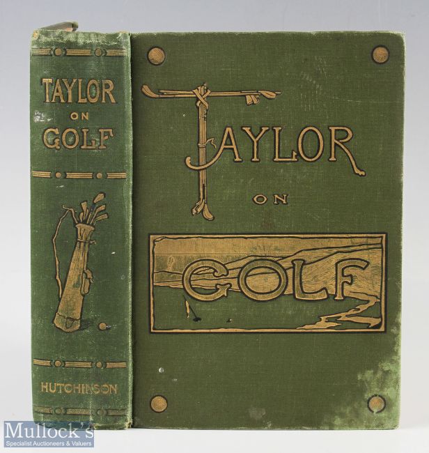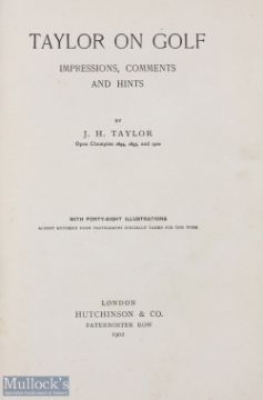 Taylor J H - "Taylor on Golf - Impressions, Comments and Hints" 1st ed 1902 in the original decorative gilt boards and spine c/w 48 photographic illustrations mostly by Beldam including the Hell Bunker at St Andrews, 9th Hole at Westward Ho!, Sandwich, and numerous other golf shots, internally clean but some discolouration to front boards, tittle page part loose, otherwise a fair - good 1st edition