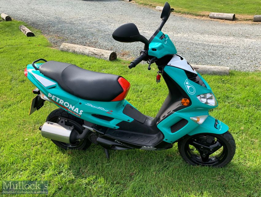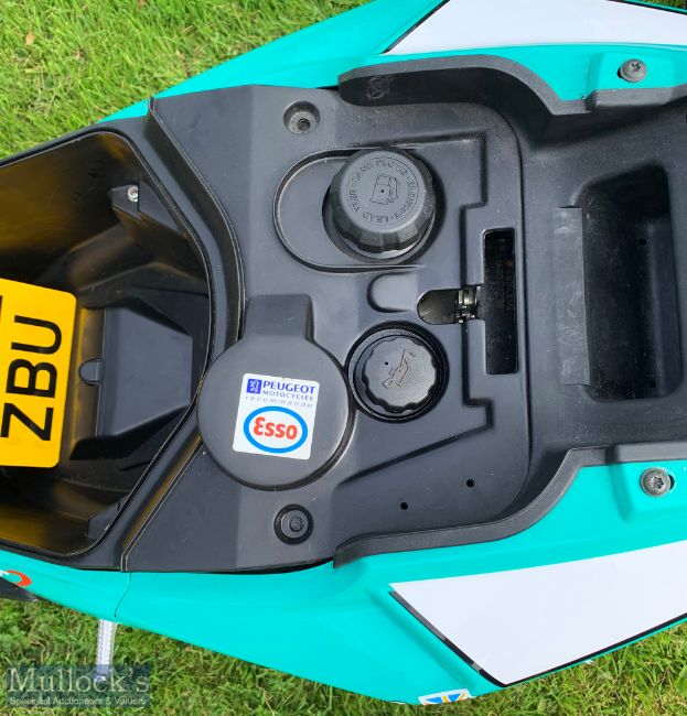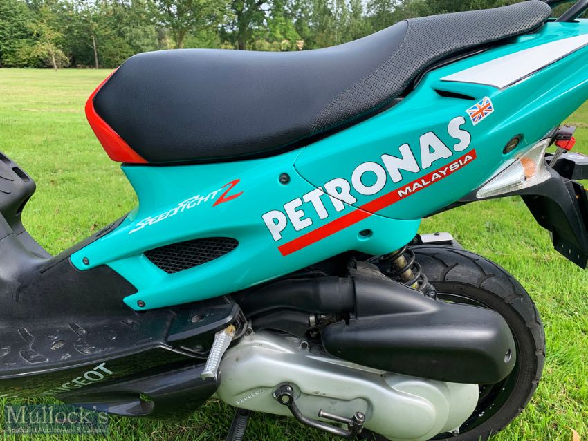 Unique Opportunity - World Champion Carl Fogarty team 'Peugeot SpeedFight 2' 100cc Paddock scooter - Registered 2002 originally owned by Foggy Petronas Racing, decorated in green and white team colours, with 'Petronas Malaysia and No1' decals. Mileage at time of cataloguing 2398, No MOT at time of auction as runs out on 20th September 2022, the scooter in general appears with light signs of use overall, please view images for further detail on condition, all in working order at time of cataloguing, video of scooter running upon request, comes with V5C document, registration HJ02ZBU (includes original number plate), engine no. 012331043, chassis no. VGAS2AB0020037692, noted that scooter runs on Super Unleaded E5 petrol at time of cataloguing, lockable helmet compartment, two ignition keys, retractable chain to rear, also includes DVD 'Foggy Against All Odds' which depicts Fogarty on the scooter. Carl Fogarty is a seven time World Champion and one of the greatest British motorcycle racers of all time. Originally obtained directly from Foggy Petronas Racing, paperwork included.