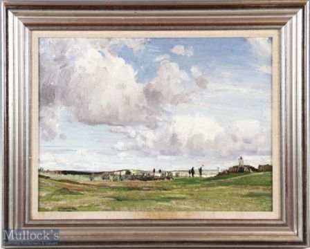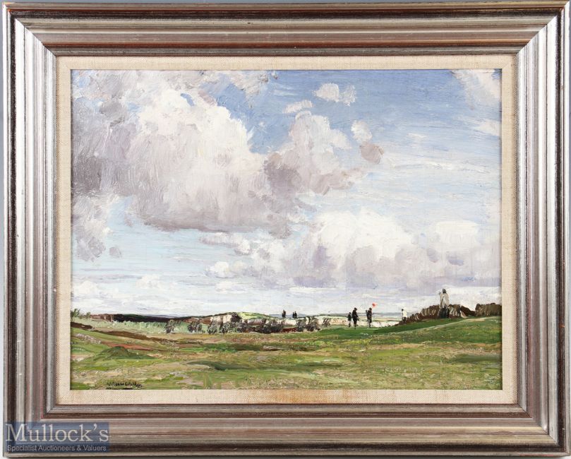 WELLS, WILLIAM PAGE ATKINSON - RBA (1872-1923) - 3rd Green Westward Ho! - Royal North Devon Golf Course oil on board signed William Wells lower left - image 12" x 16" - c/w original label laid down on the verso. Note Born Glasgow in 1872 and studied at the Slade before moving to Sydney, Australia where he lived and worked for 5 years. Returned to Europe, working in Paris under Bouguereau and Ferrier in Paris. Lived in rural France for a time where he became an admirer of the Barbizon school. After a short stay in Glasgow he settled in Preston for 7 years as a scene painter before finally settling in Devon where he became well known for his rural and landscape scenes.