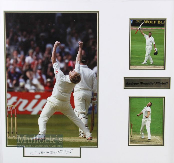 Andrew Freddie Flintoff England Cricket photographs x3 mounted in a gilt frame with signature, size 77cm x 74cm. In good condition