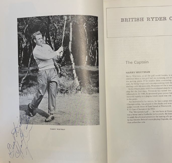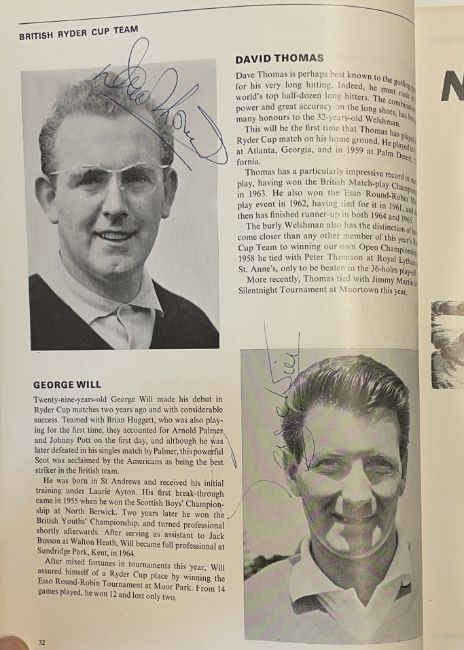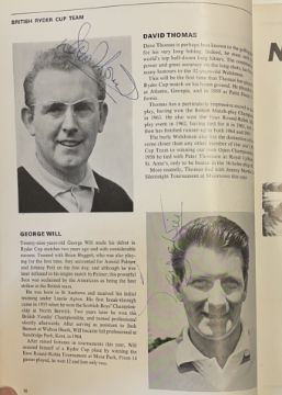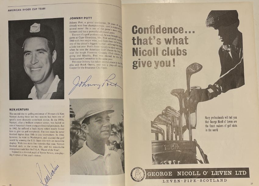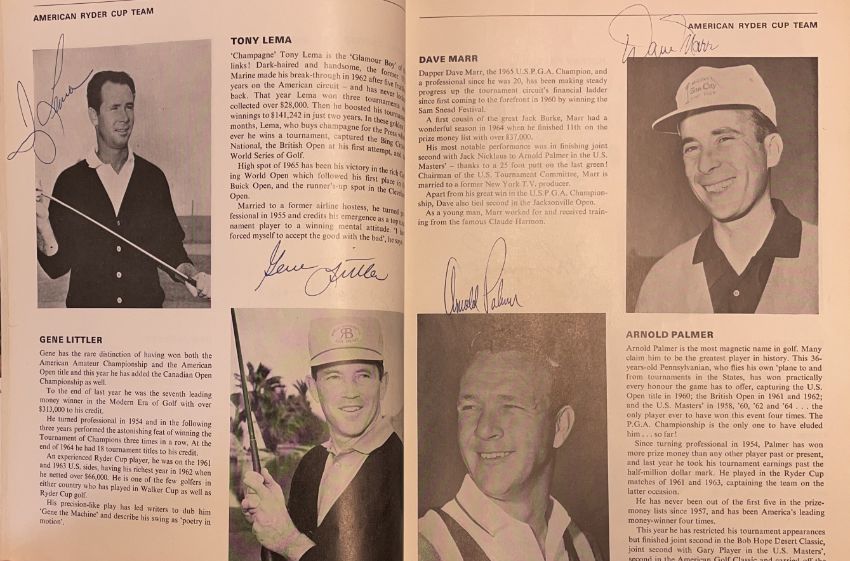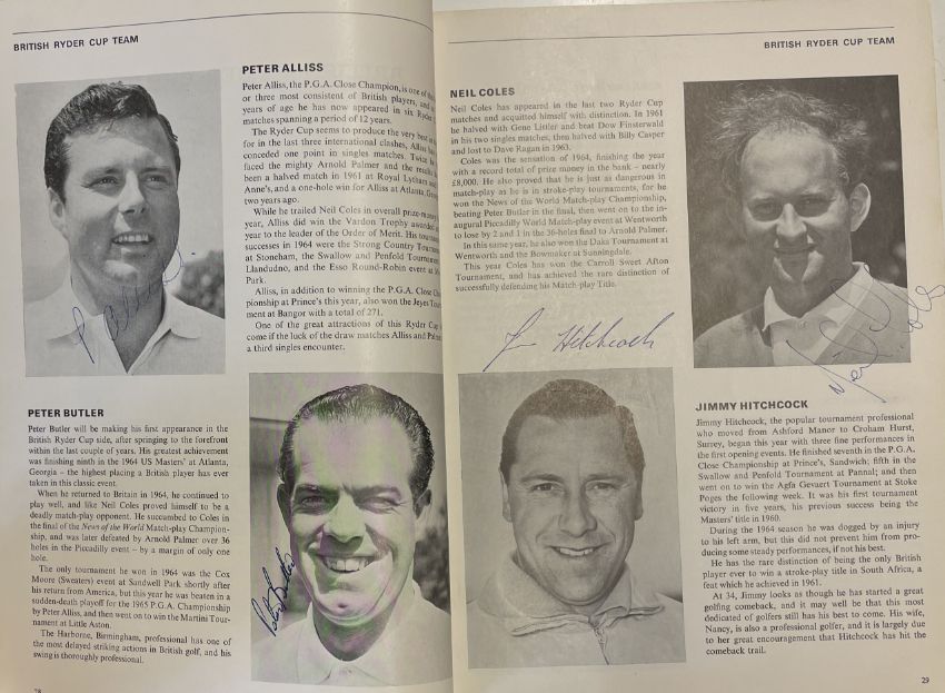 1965 Ryder Cup Signed Golf Programme played at Royal Birkdale Golf Club - signed by members of both teams to their photograph profiles to incl Byron Nelson (Capt) (front cover), Julius Boros, Billy Casper, Tommy Jacobs, Don January, Tony Lema, Gene Littler, Dave Marr, Arnold Palmer, Johnny Pott, Ken Venturi, plus GB&I players Harry Weetman (Capt), Peter Alliss, Peter Butler, Neil Coles, Jimmy Hitchcock, Bernard Hunt, Jimmy Martin, Christy O'Connor, Lionel Platts, David Thomas and George Will, clear signatures internally in ink, the programme appears overall in A/G condition