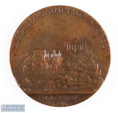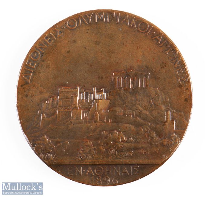 Rare 1896 Athens Olympic Second Place Bronze Medal designed by J C Chaplain (1839-1909), with name to the right of Zeus relief with inscribed 'Olympia' to the left, the reverse inscribed in Greek 'First International Olympic Games, Athens 1896', the edge stamped 'Bronze', housed in original box lined with red fabric, medal 2 inch (50mm) dia. At the inaugural modern Olympiad, first-place winners were awarded silver medals and second-place finishers earned these bronze prizes; there was no award for a third-place result. Any winner's medal from the historic debut of the Olympic Games remain exceedingly rare and are highly desirable within the world of sport.