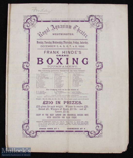 Rare and Scarce 1888 Boxing Programme at Royal Aquarium Theatre Westminster dated 3-8th December 1888 advertising Frank Hinde's Grand Boxing Tournament, offering £210 in Prizes, commencing at 8 o'clock, the programme dated for Friday to centre page, includes advertisements to the edge and rear, Sheppard & St John, Printers London, a single sheet programme, with as expected creasing, folds and minor tears apparent, still a good example and seldom seen