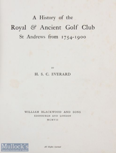 Everard, H S C - "A History of the Royal and Ancient Golf Club: St Andrews from 1754-1900" 1st ed 1907 published by William Blackwood, Edinburgh in the original green pictorial cloth boards and gilt spine (light bruising to corners and top and tail of spine), illustrated with numerous plates from photographs and paintings plus 9 coloured plates with tissue guards, gilt top edges to pages with other edges untrimmed - front and rear free end plates discoloured and some slight foxing to some pages otherwise generally clean copy. Note: This was the first written history of St Andrews Golf Club, and the illustrations include some of the first in colour of golf. A very respectable copy