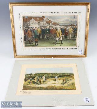 2x Interesting Michael Brown Hoylake coloured golfing prints - to include "First International Golf Match - England v Scotland - Hoylake 1902" showing Robert Maxwell about to drive off from the 1st tee together with other notable players and gallery to incl Hilton, Ball, Hutchinson, Darwin, et al  mf&g overall 16" x 22"; and "Hoylake - Playing to the Briars" showing John Ball playing a recovery shot watched by Harold Hilton, John Laidley and Lesley Balfour-Melville, together with, to the border, a miniature line drawing by Ionicus - ltd edition number 84/200 reproduced from the 1894 Life Association of Scotland Calendar  - mounted and ready for framing overall 15.5" x 20.25"