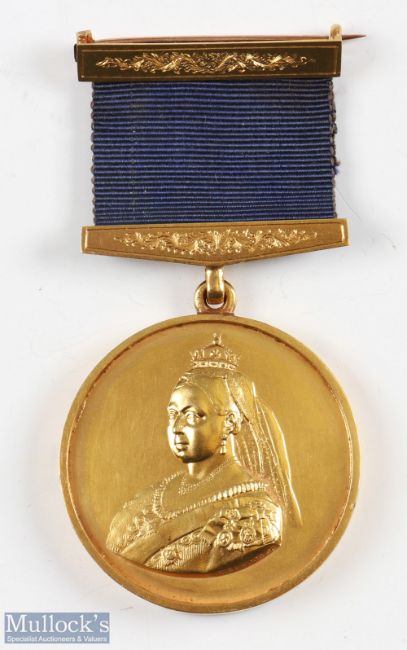 1911 Royal & Ancient Golf Club St Andrews "Queen Victoria Jubilee Vase" Gilt Medal - the obverse is embossed Royal & Ancient Golf Club St Andrews to the rim and engraved "won by William A Cargill" to the centre complete with suspension ring blue ribbon and gilt bars - the reverse embossed with head and shoulders portrait of Queen Victoria - 1.5" dia - overall 2.75". Presented in by Captain D S Stewart in 1887. Note: Part Five - Golf Collection from "David Easby Estate"