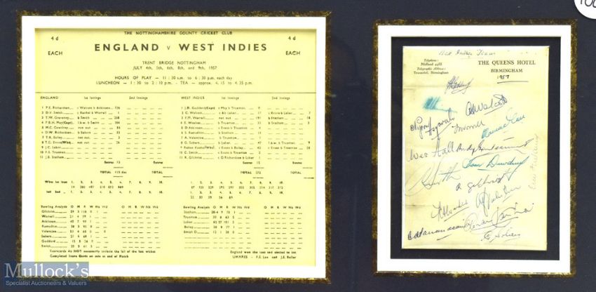 1957 Signed framed England v West Indies Display of Tom Graveney photograph, Scorecard and Hotel Headed paper, Tom Graveny scored 258 in this match, the Queen Hotel is signed by the West Indies team, framed and mounted under glass, size #37cm x 80cm.