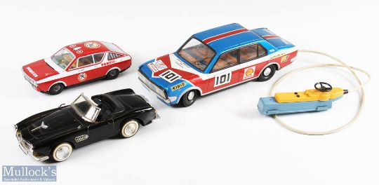 Java, Spain Remote Controlled Tinplate Seat 132 Racing Car large scale car in Monaco livery with plastic controller, with a smaller Java, Spain tinplate battery operated fire car, plus another tinplate unnamed friction powered BMW convertible in black (3)
