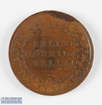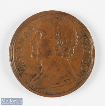 Boxing - Banbury, Prize Fighting Ring 1789, copper medallion - Obverse; Bust of Thomas Johnson - Reverse; Science and Intrepidity around Bella horrid bella 1789 in exergue, size 34mm (DH Warwickshire 12; W 1498) (Thomas Johnson the London and England champion since 1783). The match against Isaac Perrins was made at Banbury on 22nd October and, in a tournament of mixed fortune watched by 3,000 people, which lasted 75 minutes and comprised no less than 62 rounds, Johnson took victory and a large purse, reputed to be over £1,000. Perrins is said never to have fought again)