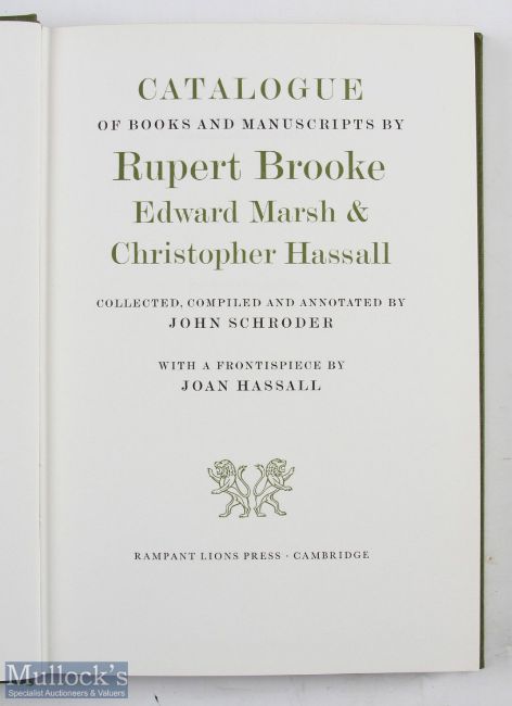 Rupert Brooke - Catalogue of books and manuscripts of Rupert Brooke, Edward Marsh and Christopher Hassall, compiled by John Schroder, first edition 1971. An invaluable compilation of the works of Brooke