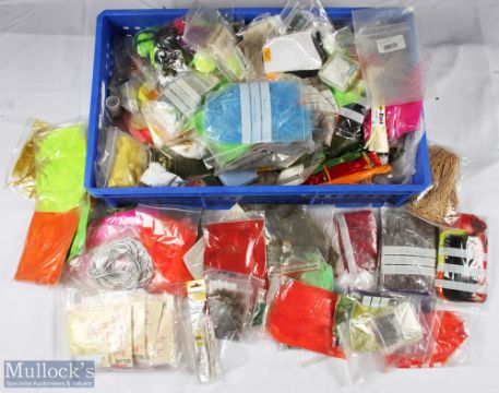 Large collection of assorted fly tying accessories - inc cock hackles, yarn, rabbit skin, frits, micro frits, raffia, suspender balls, mylar tubing etc (box)