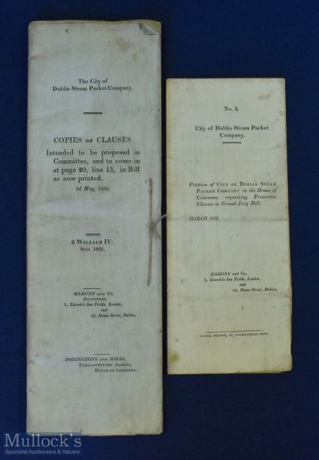 Shipping - Dublin Steam Packet Company 1833 Document - 26 page publication relating to Clauses intended to be inserted into the Bill, presumably the last chance to make changes before the Bill is presented to Parliament. The amendments appear to have been handwritten out by someone on the Committee. A scarce and unusual item, size 13" x 8 1/2". Also included is a Petition of the Trustees & Directors of the City of Dublin Steam Packet Company to Parliament. Dated March 1833. Sizes 8" x 13" (2)