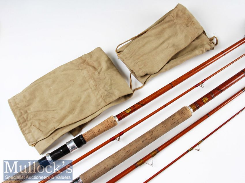 2x Interesting A E Rudge Redditch Made Match/Spinning rods - Good AE Rudge The Dorchester 10ft 2pc glass fibre with red agate tip guide, 31" slight trumpet style cork handle c/w sliding black anodised and alloy screw locking reel fittings - handle lightly soiled, very good maker's decal labels in cloth bag; and A E Rudge "The Contest" 12 foot three-piece glass fibre rod with red Agate lined tip and butt guides-fitted with chrome Modern Arms Company Ltd Bromley Kent interesting Patent Pending chrome locking reel fittings-good decal label lightly soiled cork handle in fitted cloth bag