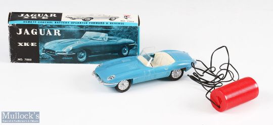 LB (Lik Be) Hong Kong Battery Operated Remote Controlled Jaguar XK-E boxed with blue body and white interior with red controller, overall good