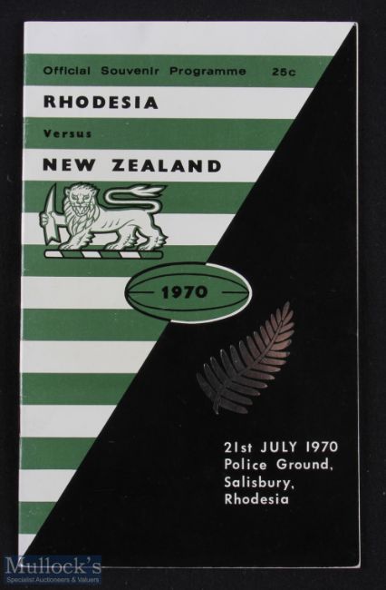 Scarce 1970 Rhodesia v NZ Rugby programme: Hard to find, interesting, attractive and detailed issue from Salisbury from the All Blacks' southern Africa tour over 50 years back. From the collection of 1970 All Black Grahame Thorne. Magnificent near mint condition, a rare chance