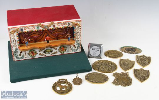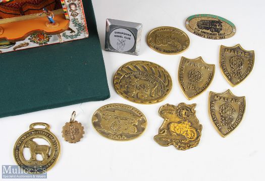 Scratch Built Alan Johnson Fairground Showman Organ Model Shrewsbury Shropshire, a wooden hand painted model with an omega vintage cassette tape player with speakers inside with a cassette of organ music, size 33cm x 17cm x 17cm, plus a selection of brass team steam rally plaques and a Shropshire model club car badge
