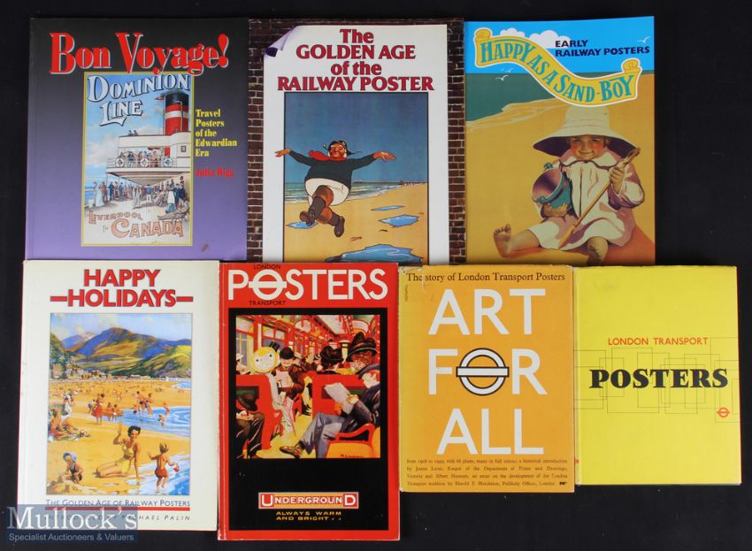 London Transport Posters Books and other related travel poster books: a good selection to include London Transport Posters 1st 1963, Art for All 1949, underground P/b 1975, happy holidays P/b 1975, happy as a sand boy P/b 1990, bon voyage P/b 1996 the golden age of the railway poster P/b 1976 - with signs of wear, (7)