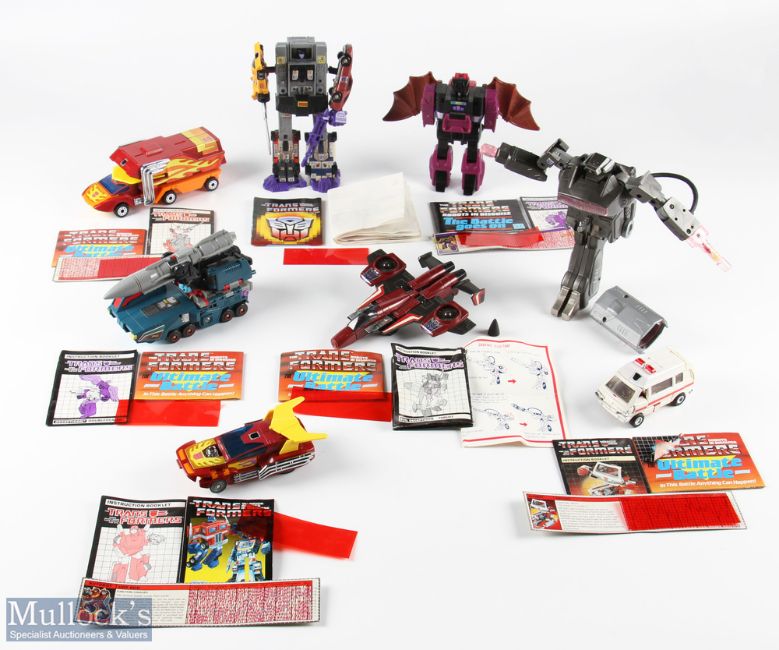 1980s Transformers Toys a good selection to include some G1 models, Menasor, Rodimus prime, Rachet, Mindwipe, Doubledealer, Hot rod, Thrust (has a loose nose cone), a copy toy the magic pistol Nike Ajax robot, with a selection of instructions and decoding sheets (8)
