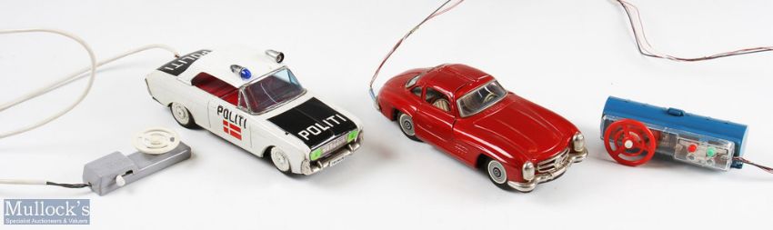Two Tinplated Battery-Operated Remote-Controlled Cars SKK, Japan Mercedes Benz 300 SL in red with opening doors, and an unnamed Switzerland police car in white with black bonnet and boot, missing wing mirrors and one blue light missing (2)
