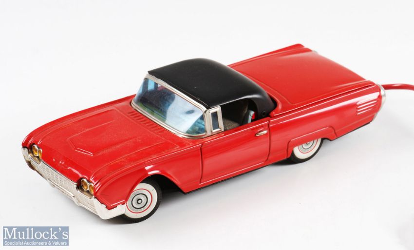 Cragstan, Japan Tinplate Ford Thunderbird with retractable top, battery operated model in red, with remote control cable attached, fitted with retractable hardtop, detailed tin printed interior and hub caps, steerable front wheels, plated parts