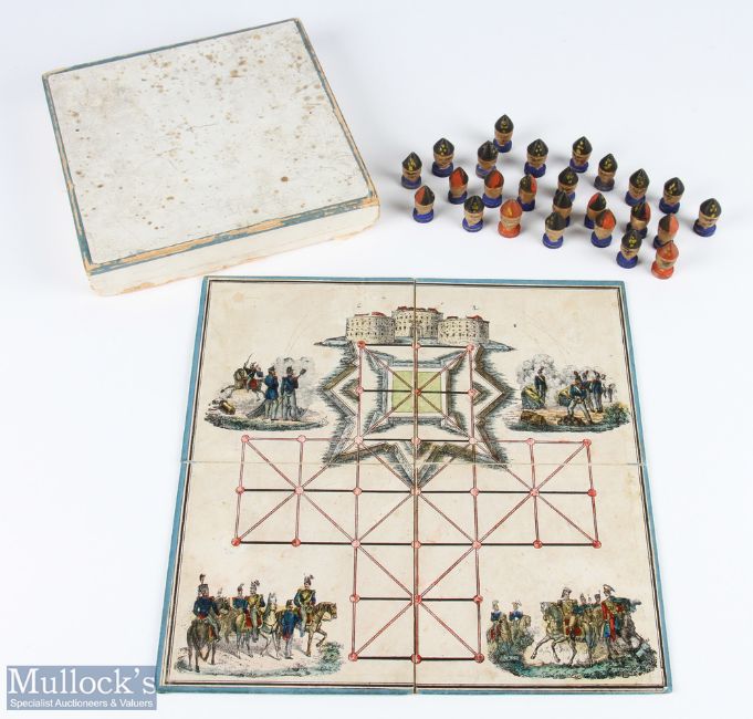 Beseiging Game c1860-1870s - probably based on the Forts at Sebastopol during the Crimean War a few years earlier. Board size 11 1/4" x 11 1/4" complete with its box and 25 hand painted wooden playing pieces