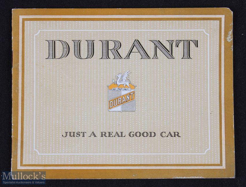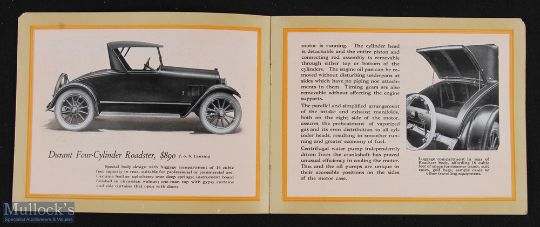 Automotive - Durant 1922 an interesting 16 page sales catalogue with illustrations of 4 models and types of cars they manufacture with details and specifications. Printed on fine semi-gloss paper in pictorial card cover, size 6" x 4 3/4". (Probably their first catalogue as company established only the previous year)