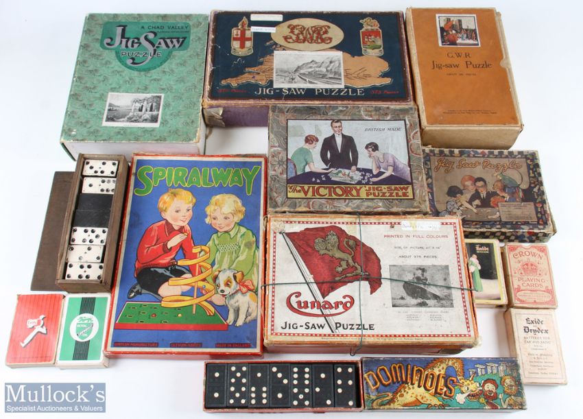 Wooden Jigsaws Playing Cards, Dominos, a good selection of early jigsaws and games -noted boxes of Victory sun & shadows, Cunard Canadian Liners 375 pieces, GWR the Romans at Caerleon, Torbay Express 375 Chad Valley spring flowers plus more (box)
