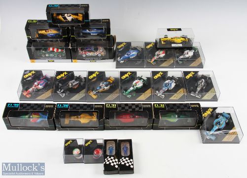 Onyx F1 and Touring Dicast Model Cars, a good selection of F1 1990, 91 92 collection cars, Drivers Helmets, Touring cars - all boxed and in good condition, (24)