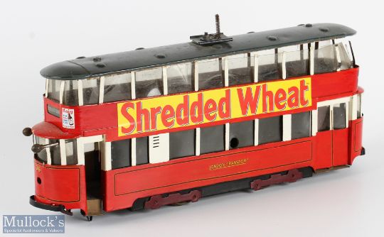 O Gauge Clockwork London Transport Double Decker Tram Car, with a stop start and verse clockwork motor, possibly made by A & J Van Riemsdyk. Has been reworked with different wheels and has been overpainted