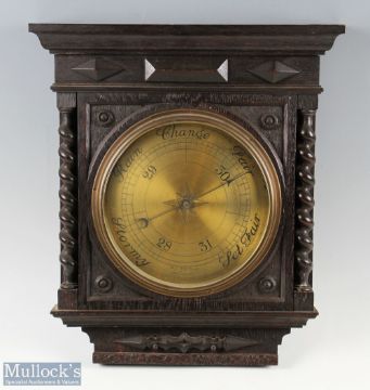 W G Whiting Manchester Barometer cased in a carved oak case with a brass engraved dial, size 37cm x 41cm