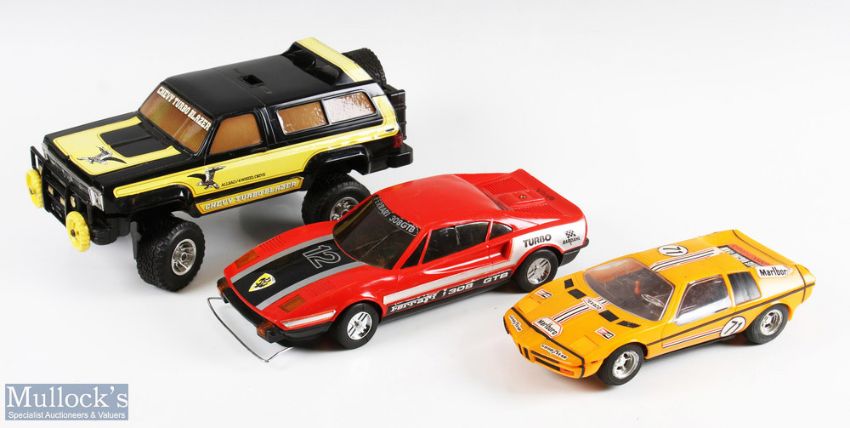 3 Remote-Controlled Large-Scale Cars inc Derwoo, Taiwan Ferrari 308GTB, Hong Kong made BMW M1 and a Shinsei Chevy Turbo Blazer car, all showing light signs of use otherwise good, all missing controllers (3)