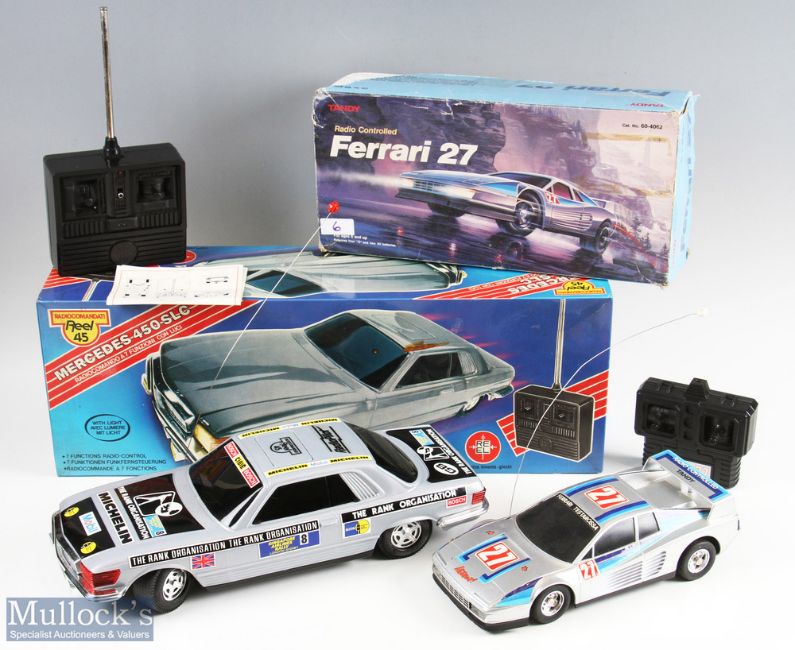 Two Boxed Large-Scale Radio-Controlled Cars Reel Mercedes 450 SLC in grey colour with racing stickers, with instruction leaflet and controller, appears overall good, together with Tandy Ferrari 27, controller missing aerial, box poor / fair condition (2)