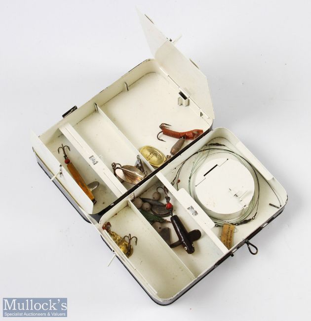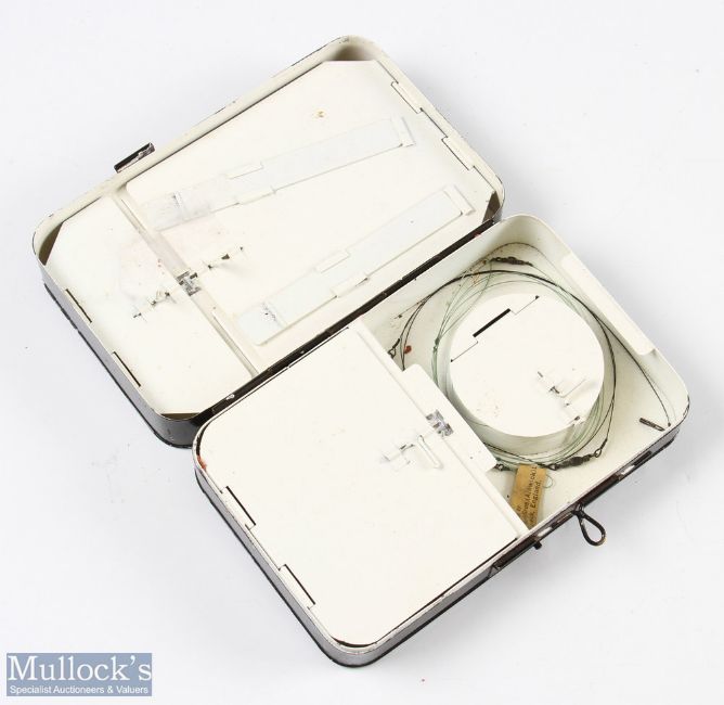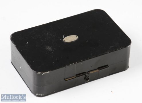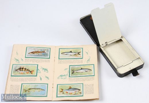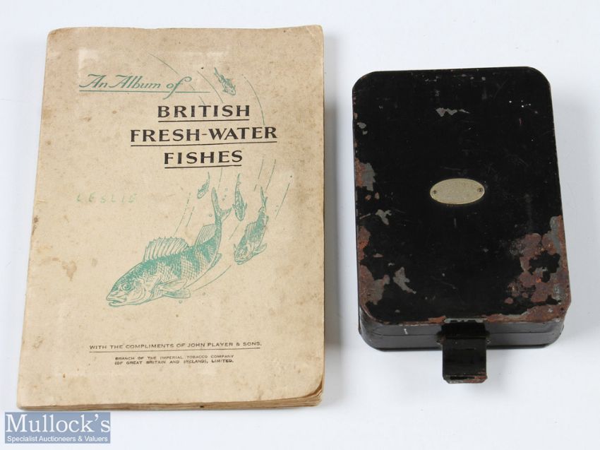 Hardy Alnwick Multi-in-parvo No.2 black japanned Spinner Box - 6" x 3.75" x 1 11/14" moveable compartments, 2 lid loops missing, 1 Mepps spoon; Hardy swimmer bait/reflex Devon, West Country Devon, 1x Hardy trace and selection of weights. Box in very good condition, together with Hardy Alnwick Trace Making Black Japanned Box - leather in lid for tools, large compartment for trace and small compartment for swivels etc, with metal flap closure; John Players British Freshwater Fishes, 50 cards all fixed in book (3)