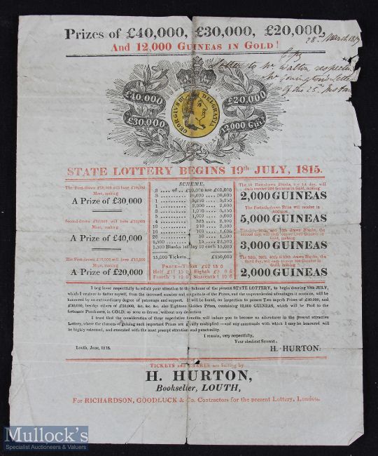 Handbill For State Lottery Prize of 12,000 Guineas in Gold 1815 - unusual as early three colour printing. Has illustration of Guinea Coin top centre. The local Agent being H Hurton, Bookseller in Louth, Lincolnshire