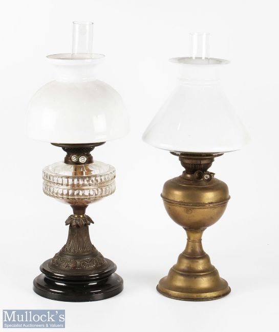 2x Period and Antique Oil Lamps both with milk glass shades, a brass lamp with funnel and shade, a glass and ornate metal decorated stand clear cut glass reservoir and a Wright & Butler duplex burner (2)