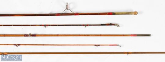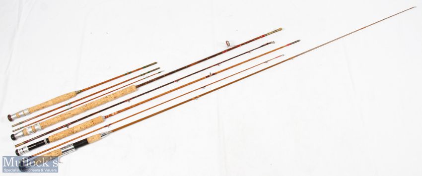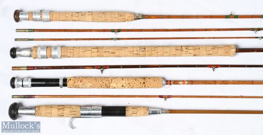 Martinez & Bird Redditch 7ft 4in split cane rod (possibly shortened), 2 piece, signs of use and wear throughout, together with Lindop light Pike Rod 7ft 2 piece split cane rod in Allcocks cloth bag, unnamed split cane travel rod 5ft 7in 3 piece and an unnamed spinning rod with detachable butt overall measures 5ft 8in, mixed condition (4)